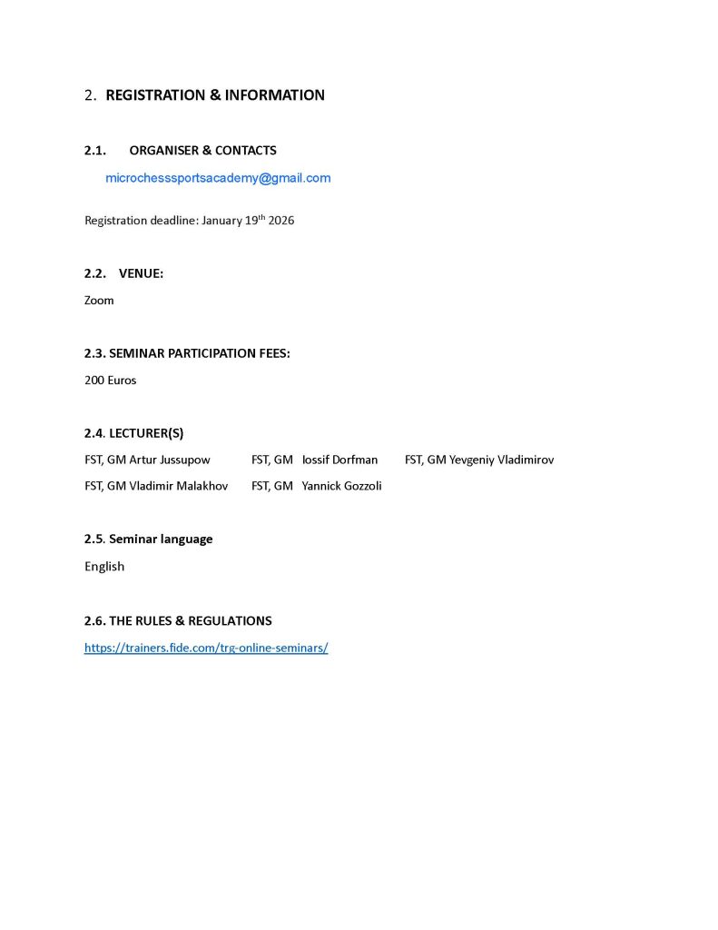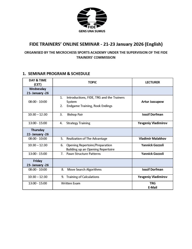 Important NewsSeminar NewsUpcoming Seminars & Workshops FIDE TRAINERS’ ONLINE SEMINAR – 21-23 January 2026 (English) 13/01/2026 trg