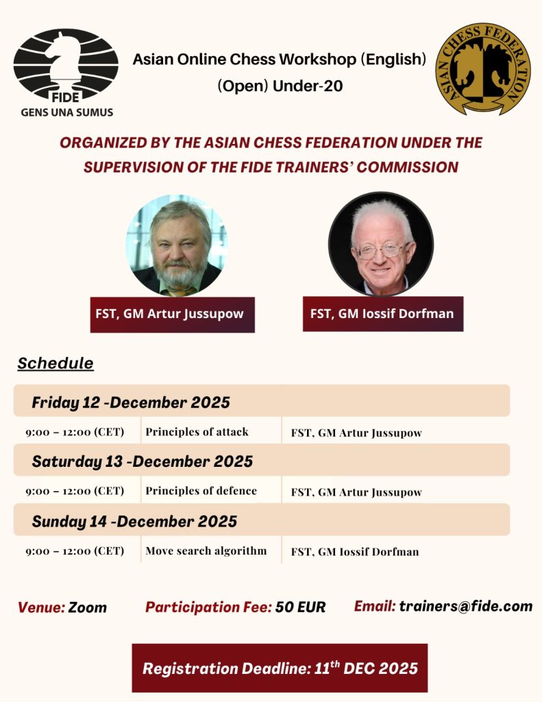 Important NewsSeminar NewsUpcoming Seminars & Workshops Asian Online Chess Workshop (Open) Under-20 (English), 12-14 December 2025 09/12/2025 trg